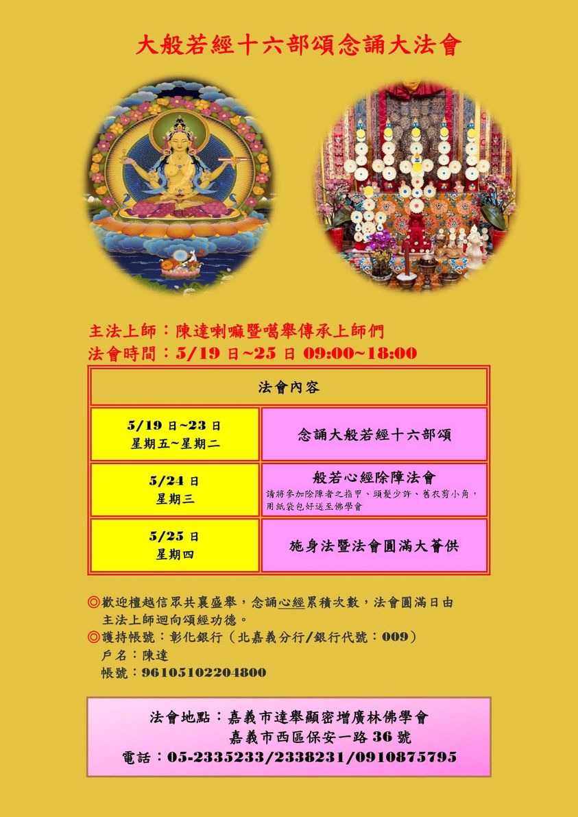 達舉顯密增廣林 大般若經十六部頌法會 主法上師:陳達喇嘛 暨 噶舉傳承上師們 噶舉 法會 2023/05/19~2023/05/25 一年一度大般若經十六部頌法會 即將舉行,歡迎共襄盛舉 主法上師:陳達喇嘛 暨 噶舉傳承上師們 https://www.facebook.com/profile.php?id=100076060385703 相關資訊 友善列印 上一篇:薩迦天津法王 三怙主合一灌頂(觀音.文殊.金剛手) 下一篇:夏尊法王禪定日-夏尊達浪祈福法會 精選法訊 114/10/31 蓮師薈供 2025/10/31 噶舉 法會 恭迎「布尼瑪喇嘛」蒞臨台灣一起現場共修 2025/11/01~2025/11/29 噶舉 共修 哲蚌吉祥果芒佛學會『初次★遇見佛法』 2025/11/01~2025/12/13 格魯 修行 出海供龍王寶瓶、水供、放生、長壽經大法會 2025/11/01 寧瑪 法會 噶舉第一護法:瑪哈嘎拉大除障 2025/11/01~2025/11/02 噶舉 法會 妙法樂苑11~12月課表 2025/11/01~2025/12/31 格魯 課程 慈悲僧伽11月法訊公告 2025/11/01~2025/11/30 顯教 法會 2025年 11月 德威仁波切 主法法會 2025/11/01~2025/11/30 寧瑪 法會 喇嘛網| Facebook 全球慈悲智慧數位佛學院 全球藏傳佛教最新弘法訊息﹝ Google全球第一資訊同步 ﹞
