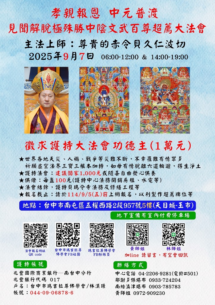 114/9/7見即解脫中陰文武百尊超渡法 主法上師:尊貴的 赤令貝久仁波切 噶舉 法會 2025/08/19~2025/09/07 我要參加 我要祈福 尊貴赤令貝久仁波切 徵求護持大法會功德主(1萬元) 【報名網址】https://www.beclass.com/rid=30500b76894b081257a2 【主法上師】尊貴的赤令貝久仁波切 【內容】見即解脫中陰文武百尊超渡祈福法會 【日期】114/9/7(日) 【時間】上午06:00-12:00&下午14:00-19:00 【法會地點】台中市南屯區五權西路2段957號5樓(天目城-玉市) ★室內備有付費停車場 【備註】 1.請提早報名以利製作超渡牌位及消災祈福名單 2.9/5(五)報名系統關閉報名 3.當日約10位僧眾 ---------------- ★詳情請見法訊 ---------------- 【護持法會項目】 一、贊助法會:建議闔家1000元或歡迎自由發心隨喜贊助 二、供燈:每盞100元(護持中心法務開銷房租、水電等) ★法會結餘:護持貝瑪令寺法務及修繕工程等 ------------------- 【護持帳號】 兆豐國際商業銀行─南台中分行 兆豐銀行代碼 017 戶名:台中市瑪吉拉尊佛學會/林漢璟 帳號:044-09-06878-6 【聯絡電話】 中心電話 04-2206-9281(電鈴#501) 耶謝多傑堪布 0933-724204 南給滇津堪布 0903-785783 林師姐 請掃描QR code加line 黃師姐 0972-909230(搜尋電話可加LINE) 相關資訊 友善列印 上一篇:114/8/16塔爹炯西瑟波施身法除障 下一篇:臺灣哲蚌吉祥果芒佛學會中元超薦祈福法會 台中市瑪吉拉尊佛學會 偉大的不丹竹巴噶舉傳承 ~ 成就者之王 夏迦師利傳承 - 二位真正實修 , 都曾代表不丹國師的 LAM 仁波切 密勒日巴尊者夢授破瓦法 . 施身法 . 及各類甚深教法,口傳傳授 每月不定期舉辦灌頂 . 除障 . 薈供 . 超渡 . 火供..等法會 施身法共修 聯絡電話: :0972-909230 地址 : 台中市西區篤信街43巷20號5樓之1 精選法訊 2025年 10月 德威仁波切 主法法會 2025/10/17~2025/10/29 寧瑪 法會 天龍八部護法&酬供食子製作教授 2025/10/17 寧瑪 教學 財寶天王法會 2025/10/18 格魯 法會 10/18《地藏·蓮師速降加持雨法會》 2025/10/18 寧瑪 法會 放生息災延壽法會 2025/10/18 寧瑪 放生 2025龍王地基主酬懺灌頂法會 2025/10/19 薩迦 灌頂 白雅仁波切圓寂三周年紀念法筵 2025/10/24 寧瑪 灌頂 10月26日豐原財寶天王招財法會 2025/10/26 格魯 法會 喇嘛網| Facebook 全球慈悲智慧數位佛學院 全球藏傳佛教最新弘法訊息﹝ Google全球第一資訊同步 ﹞