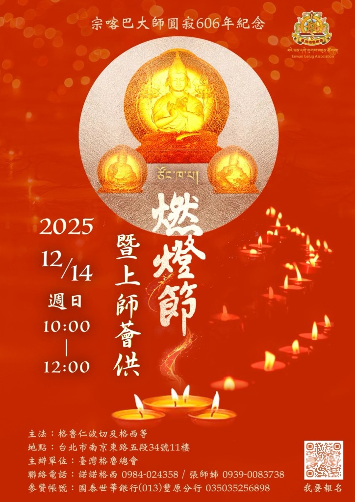 臺灣格魯總會2025燃燈節暨上師薈供 格魯 法會 2025/12/14 2025年燃燈節暨上師薈供法會 謹訂於114年12月14日(日) 上午10:00舉行 法會備有消災超薦牌位 歡迎踴躍參加 隨喜參贊 同霑法益 共沐法喜 表單連結 https://forms.gle/bWXLF1dBZqPVNfLg6 友善列印 上一篇:祭龍食子&龍煙供法會 下一篇:秋林傳承普巴金剛灌頂除障大法會 精選法訊 11/7-11/9頂髻尊勝佛母千供延壽 2025/11/07~2025/11/09 噶舉 法會 祭龍食子&龍煙供法會 2025/11/07 格魯 法會 11/7龍王日~龍供-祭龍食子暨百食子供 2025/11/07~2025/11/30 格魯 法會 2025年蓮師滿願塔‧博達佛塔─盛大供燈 2025/11/08~2025/11/11 薩迦 共修 上師與觀音無別瑜伽 課程及閉關 2025/11/08~2025/11/23 格魯 閉關 2025年11月熹嘉仁波台灣弘法 2025/11/08~2025/11/23 格魯 法會 熹嘉仁波切金剛經口傳暨教授課程 2025/11/08~2025/12/07 格魯 課程 天降日報恩培福大法會 2025/11/10~2025/11/11 寧瑪 法會 喇嘛網| Facebook 全球慈悲智慧數位佛學院 全球藏傳佛教最新弘法訊息﹝ Google全球第一資訊同步 ﹞