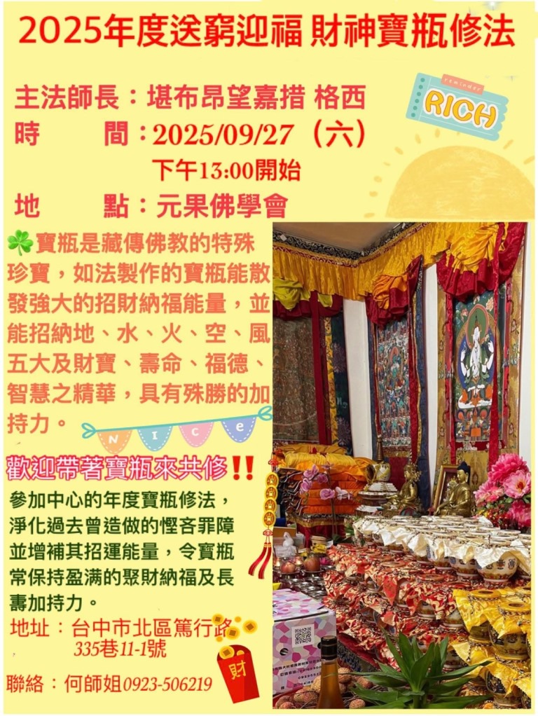 2025年度送窮迎福 財神寶瓶修法 主法上師:堪布昂望嘉措 格西 格魯 法會 2025/09/27 尊貴昂望嘉措格西 2025年度送窮迎福 財神寶瓶修法 主法師長:堪布昂望嘉措 格西 時間:2025/09/27(六) 下午13:00開始 地點:元果學會 寶瓶是藏傳佛教的特殊珍寶,如法製作的寶瓶能散發強大的招財納福能量,並能招納地、水、火、空、風五大及財寶、壽命、福德、智慧之精華,具有殊勝的加持力。 歡迎帶著寶瓶來共修!! 參加中心的年度寶瓶修法,淨化過去曾造做的慳吝罪障並增補其招財運能量,令寳瓶常保持盈满的聚財納福及長壽加持力。 地址:台中市北區篤行路335巷11-1號 聯絡:何師姐0923-506219 友善列印 上一篇:【法 訊】2025/10/2-蓮師薈供 下一篇:經續法林10月課程表 精選法訊 2025年 10月 德威仁波切 主法法會 2025/10/17~2025/10/29 寧瑪 法會 天龍八部護法&酬供食子製作教授 2025/10/17 寧瑪 教學 財寶天王法會 2025/10/18 格魯 法會 10/18《地藏·蓮師速降加持雨法會》 2025/10/18 寧瑪 法會 放生息災延壽法會 2025/10/18 寧瑪 放生 2025龍王地基主酬懺灌頂法會 2025/10/19 薩迦 灌頂 白雅仁波切圓寂三周年紀念法筵 2025/10/24 寧瑪 灌頂 10月26日豐原財寶天王招財法會 2025/10/26 格魯 法會 喇嘛網| Facebook 全球慈悲智慧數位佛學院 全球藏傳佛教最新弘法訊息﹝ Google全球第一資訊同步 ﹞