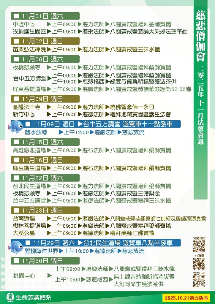 慈悲僧伽11月法訊公告 顯教 法會 2025/11/01~2025/11/30 慈悲僧伽2025年11月法訊公告 法會備有免費消災超薦牌位填寫 敬邀菩薩大德踴躍前往參加,同霑法益,共沐佛恩 友善列印 上一篇:妙法樂苑11~12月課表 下一篇:彰化弘願念佛會2026年行事曆 精選法訊 2025八德佛堂7-12行事曆 2025/10/25~2025/12/29 寧瑪 共修 經續法林2025年度寶瓶修法 2025/10/25~2025/11/22 格魯 法會 開顯趨入甚深金剛瑜伽之道 2025/10/25~2025/11/29 格魯 課程 10月26日豐原財寶天王招財法會 2025/10/26 格魯 法會 2025 佐欽《聖綠度母祈福煙供法會》 2025/10/26 寧瑪 法會 10/26吉祥天母暨護法酬懺薈供除障法會 2025/10/26~2025/11/05 格魯 法會 『鄔金空行財神』無戲依一物增益祈福火供 2025/10/26 寧瑪 火供 南開寧波仁波切道場11月法訊 2025/10/28~2025/11/30 寧瑪 法會 喇嘛網| Facebook 全球慈悲智慧數位佛學院 全球藏傳佛教最新弘法訊息﹝ Google全球第一資訊同步 ﹞